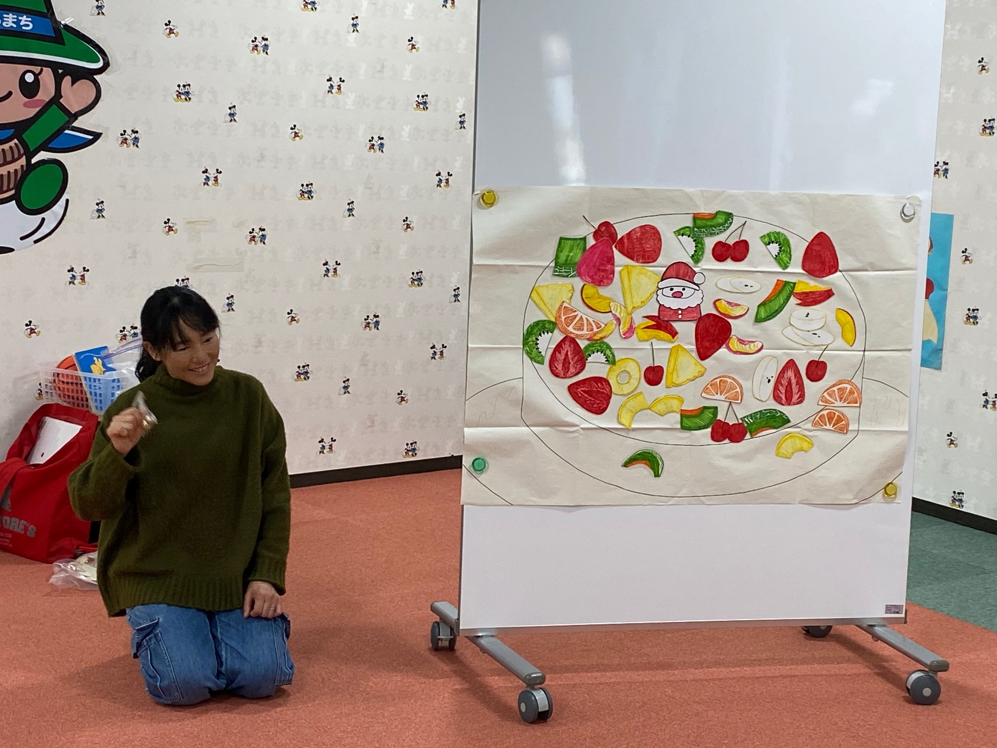 「もうすぐクリスマス!ケーキにフルーツのデコレーションをしました。鈴を持ってクリスマスソング♪も歌いましたよ(^^)/」次回は12/27(土)です。皆さんお気軽にお越しください♪